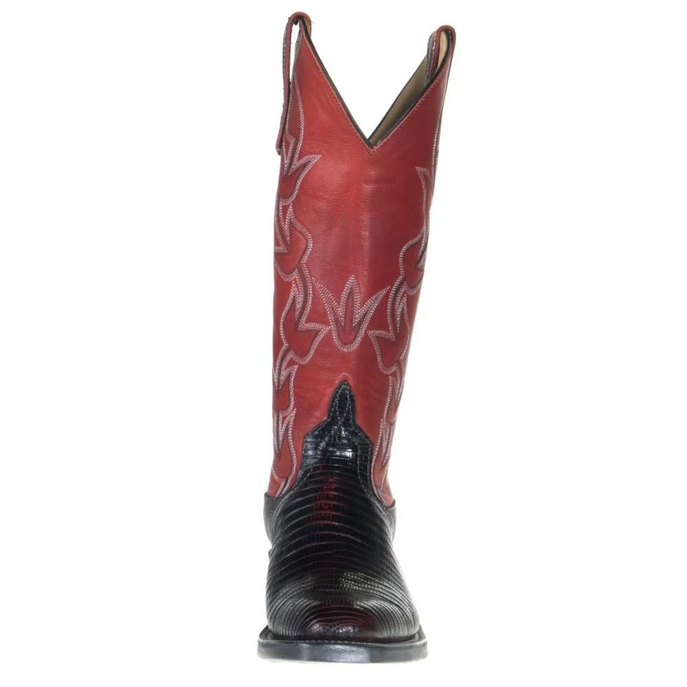 Ladies dress your outfit up with our black cherry lizard with red top cowgirl boots from Anderson Bean.