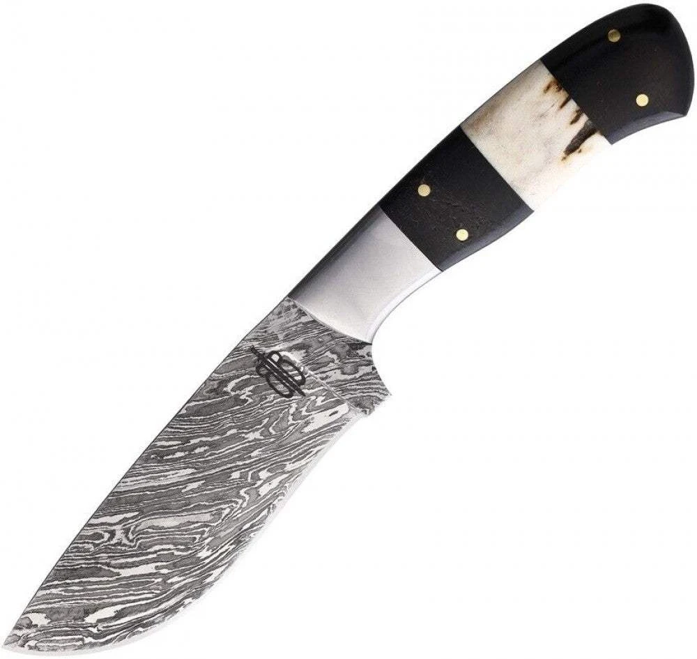 The Cowboy Hunter Knife from BnB features a drop point 256-layer Damascus (1095 & 15N20) stainless steel blade with a slight recurve and decorative jimping along the base of the blade’s spine. Taper grind. The polished full tang is covered with polished stainless steel, G10 and stag horn scales with brass pins. Includes genuine leather sheath.