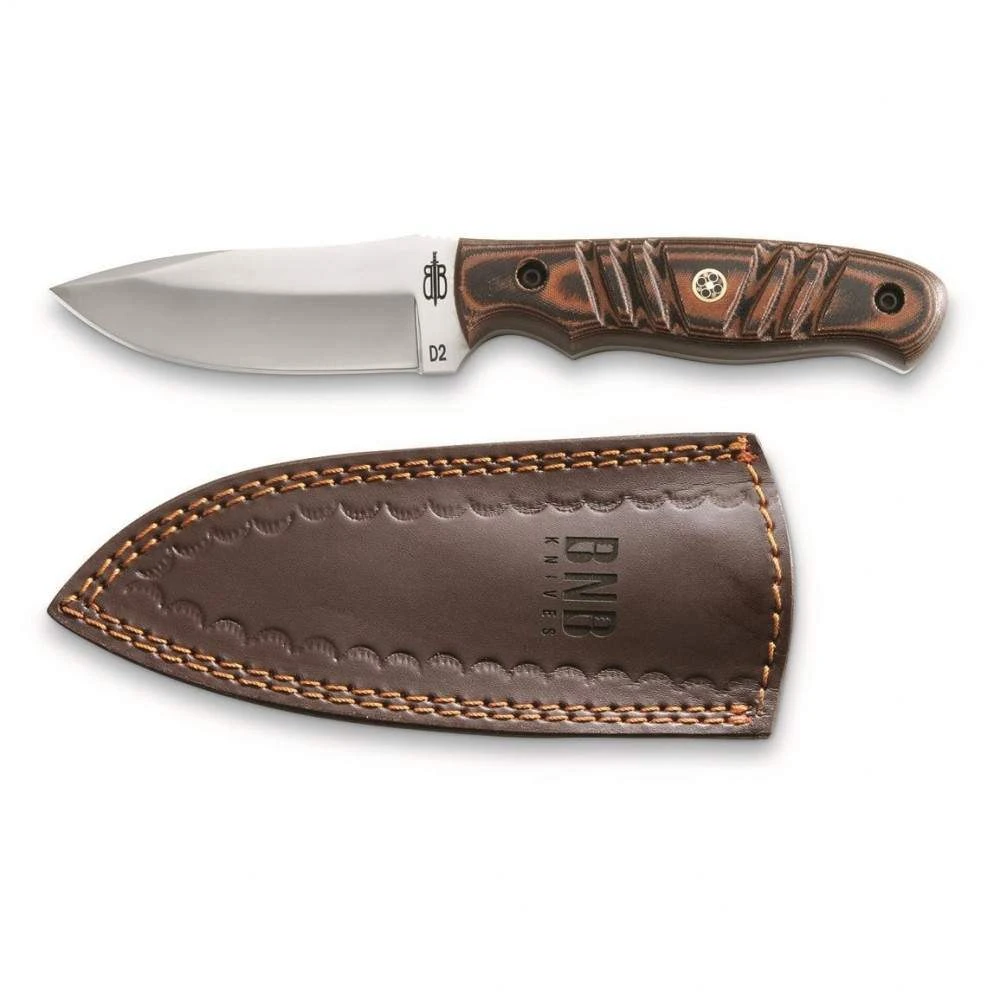 BnB’s small Mamba hunter is the perfect everyday carry! Its compact design makes the carry light, you’ll forget it’s even there. This knife features D2 steel blade with an extended belly edge and jimping like grooves along its spine. G10 handle makes the feel comfortable. Leather Sheath with belt clip includes. Each BnB Knife comes with a lifetime warranty.