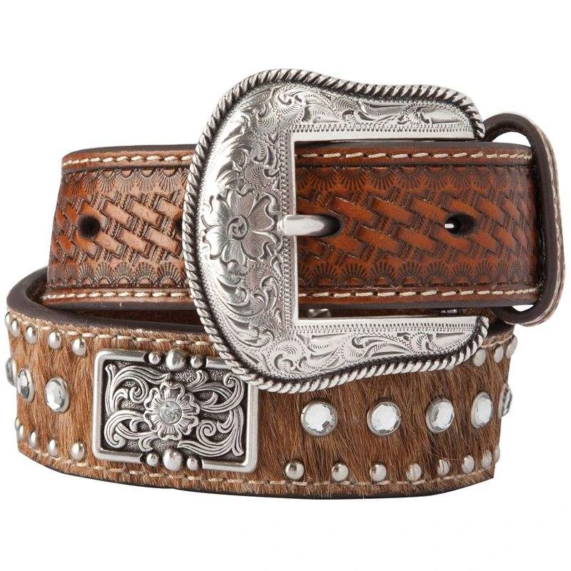 This boy’s western belt by M&FΒ is made of basket weave brown leather and cowhide or brindle on the back side. On the cowhide hair there are rectangle silver conchos with large rhinestones and silver studs. This is a great looking western belt for little cowboys that want to show off their style!