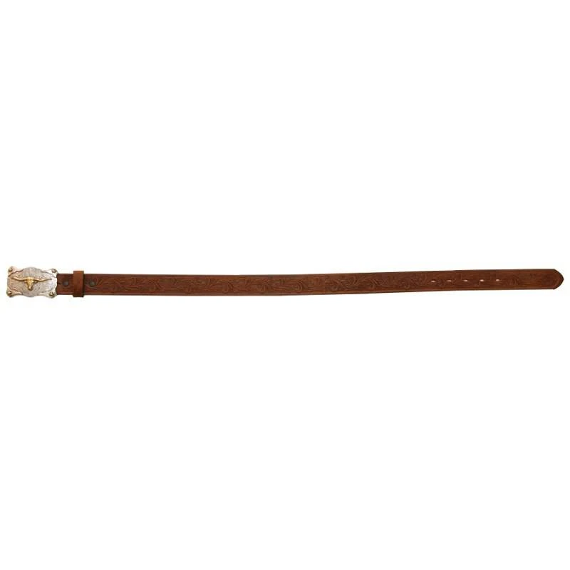This boy’s western belt by Tony Lama is a 1″ wide brown leather that is hand tooled with a floral design. There is a matching leather keeper that is great for keeping the end of the belt in place. The buckle is a silver square that has floral engraving and details. There is a raised longhorn head in the center that is gold and there are gold stars in the corners. This belt is a great belt for your little guy to wear to complete the outfit. This belt is simple so it will pair well with every shirt and jeans he has on. Although this belt is named Little Texas, you do not have to be a Texas to wear this belt! Any little cowboy can wear this belt, no matter which state they’re in!