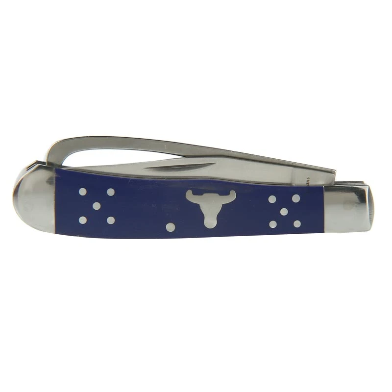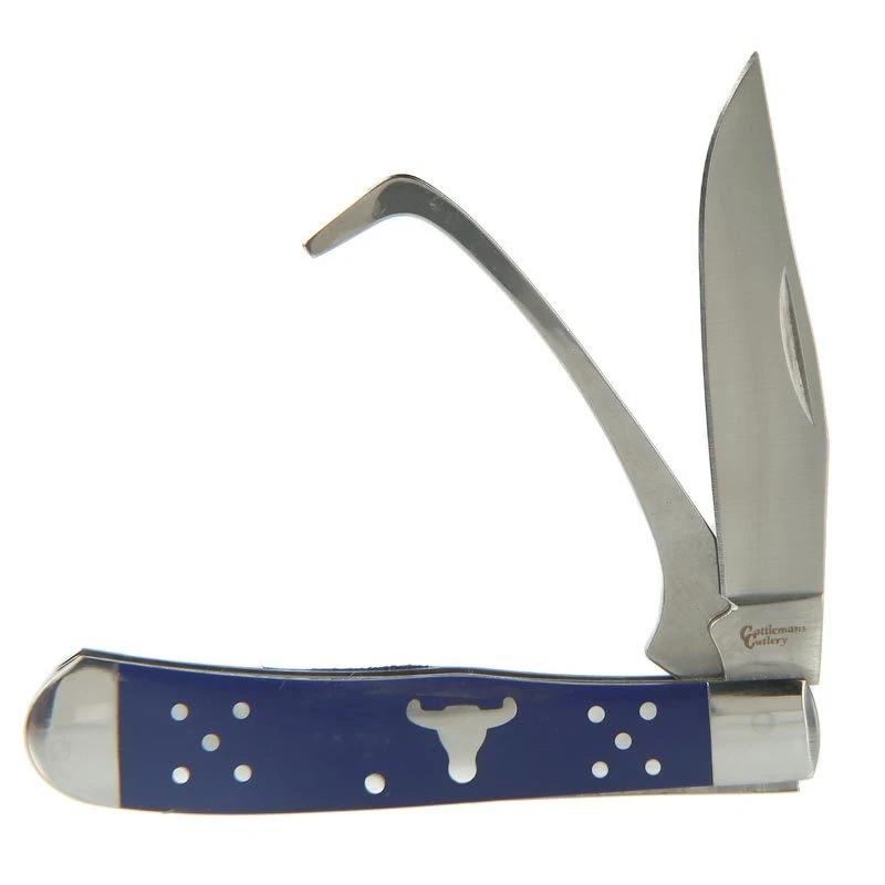 The Cattlemans Cutlery Blue Farriers Trapper knife features a deep blue, impact-resistant, derlin handle and measures 4.25″ closed.
