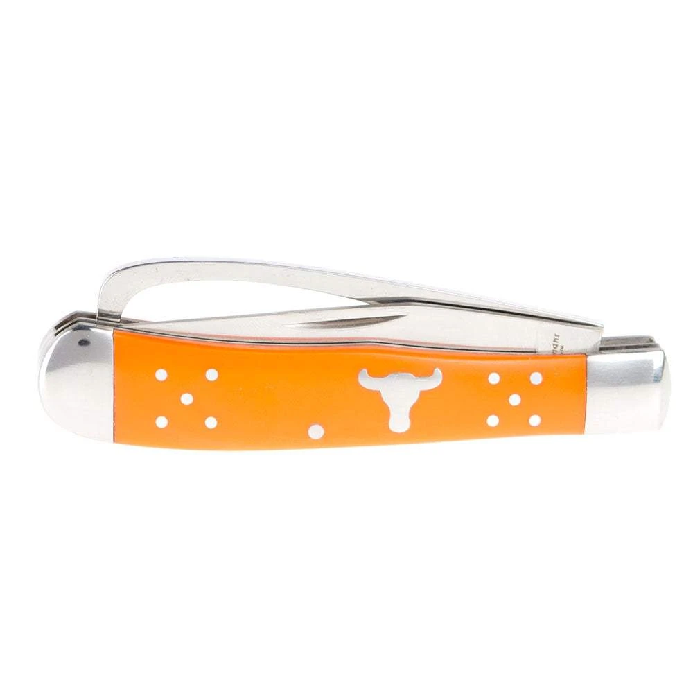 The Cattlemans Cutlery Brahma Bull Farriers Trapper knife features an impact-resistant, derlin handle and measures 4″ closed.