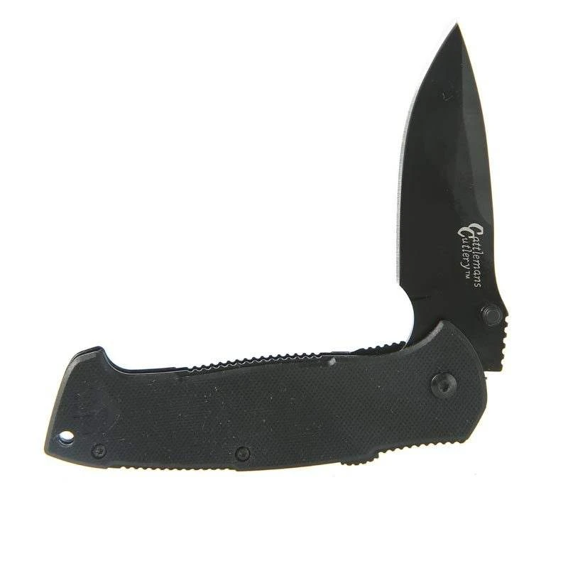 The Cattlemans Cutlery Shadow Bandit Assisted Opener Knife features a black coated stainless steel blade and measures 4 1/2″ closed.