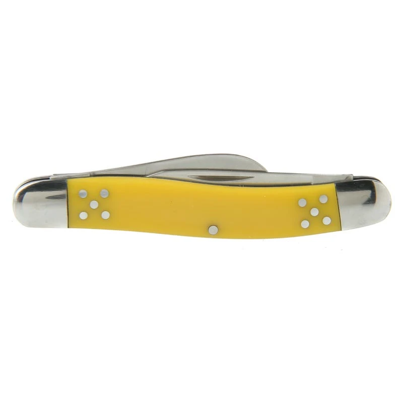 The Cattlemans Cutlery Yellow Stockman Knife features a vibrant yellow, impact-resistant, derlin handle and measures 3 1/2″ closed.