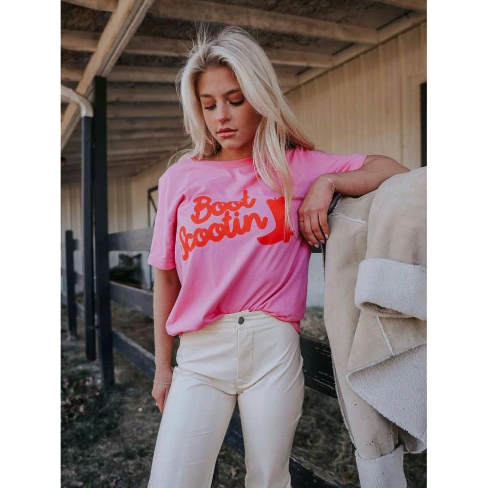 Think pink in your boots! this barbie pink tee pairs well with a leather jacket, kneeĀ high boots and your favoriteĀ cowgirl hat!