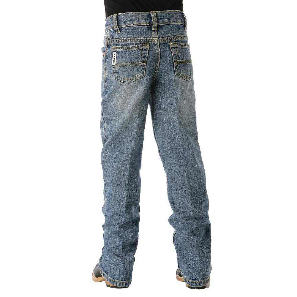 tag on it. These White Label jeans have a zip up front and a button closure. These are made with 12 oz. denim and 100% cotton so any little cowboy will feel comfortable wearing them whether they are playing outside or competing in a rodeo. They are available in sizes 8, 10, 12, 14, 16, 18. This pair of Cinch blue jeans will look great with a Cinch button down shirt and his favorite pair of cowboy boots! Cinch has always made the highest quality cowboy jeans you can get, so there is no question when it comes to kids jeans that they provide good looking and durable jeans for the little guys in our lives!