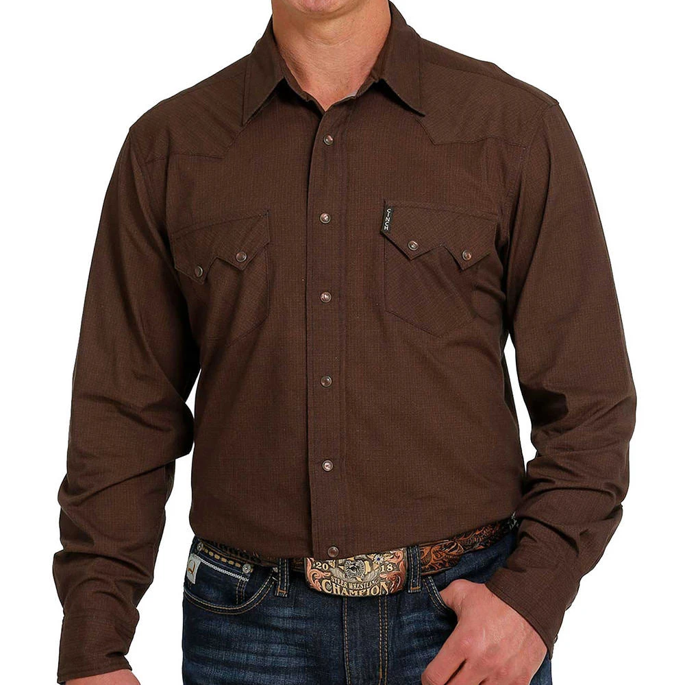When comfort is key, opt for a printed cotton-spandex plain weave like this one engineered by CINCH. Extra stretch provides day-long wearability, with design details including an open left front pocket, embroidered logo and snaps.