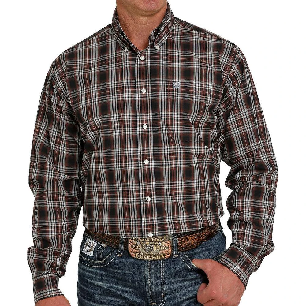 When comfort is key, opt for a printed cotton-spandex plain weave like this one engineered by CINCH. Extra stretch provides day-long wearability, with design details including an open left front pocket, embroidered logo and white buttons.