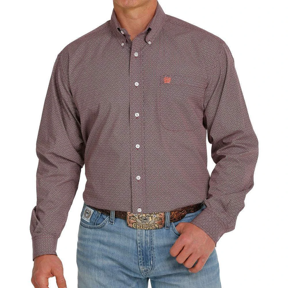 Add class to your best pair of blue jeans wearing a burgundy geometric printed cotton plain weave engineered by CINCH. This handsome shirt features an open left front pocket with logo embroidery and traditional white buttons.
