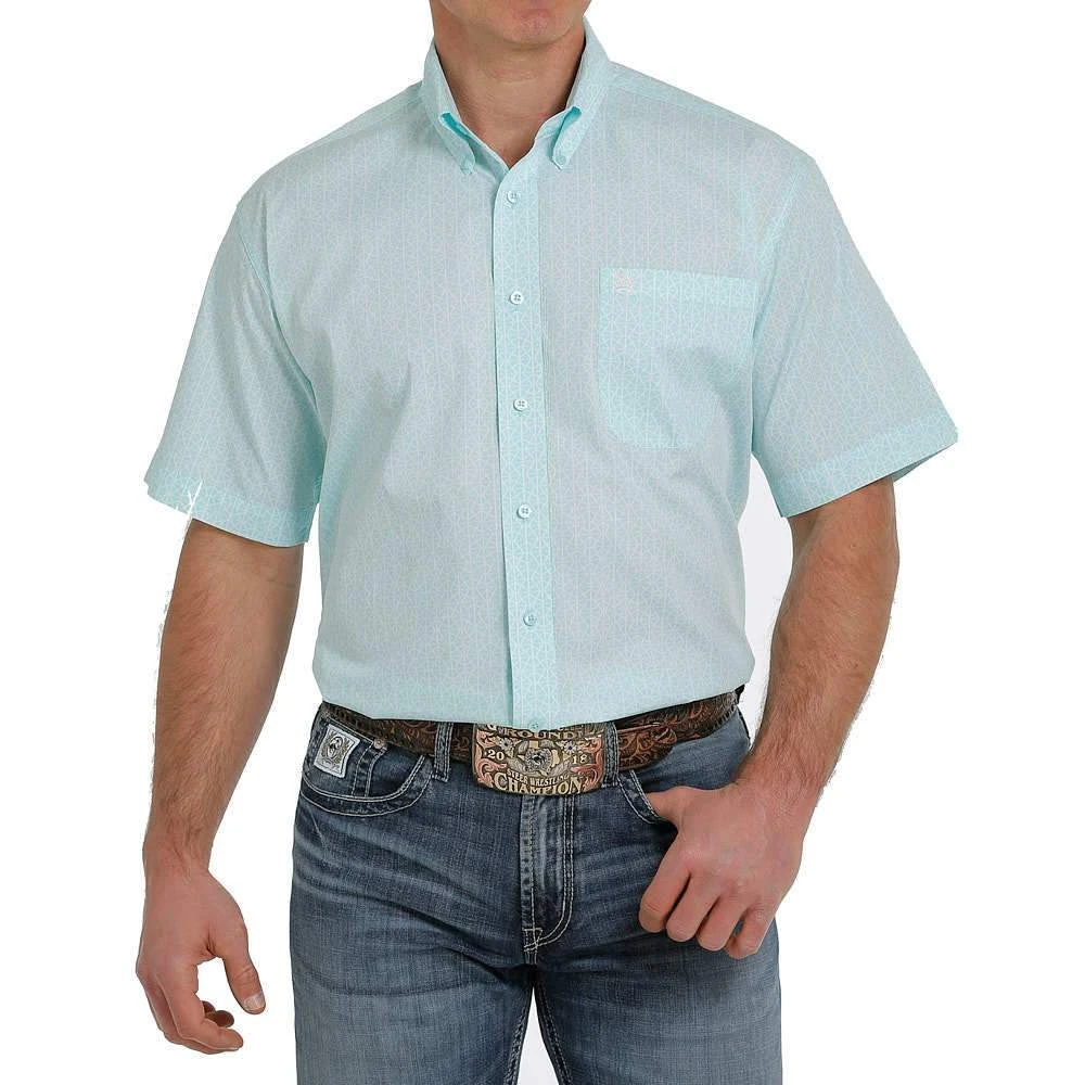 Go for a casual look wearing our light blue print, short sleeve buttondown by Cinch.