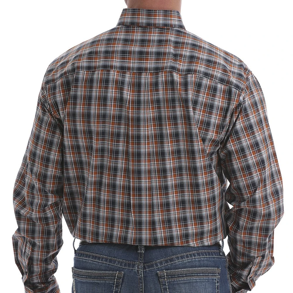Step out in style and comfort in our khaki/navy plaid shirt!