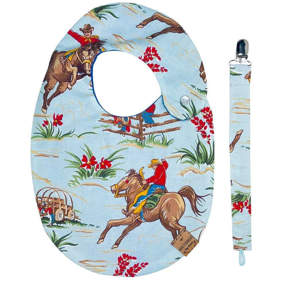 This cowboy bib set makes the perfect gift! Made of 100% cotton with flannel backing. Features snap closure.Â