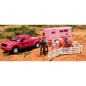 Includes 11″ x 3-1/2″ x 3-1/2″ truck, 8″ x 3-1/2″ x 5″ trailer, 2 cowgirls, 2 horses, 2 saddles, 3 barrels, feeders with hay and fencing. 3″ figures.