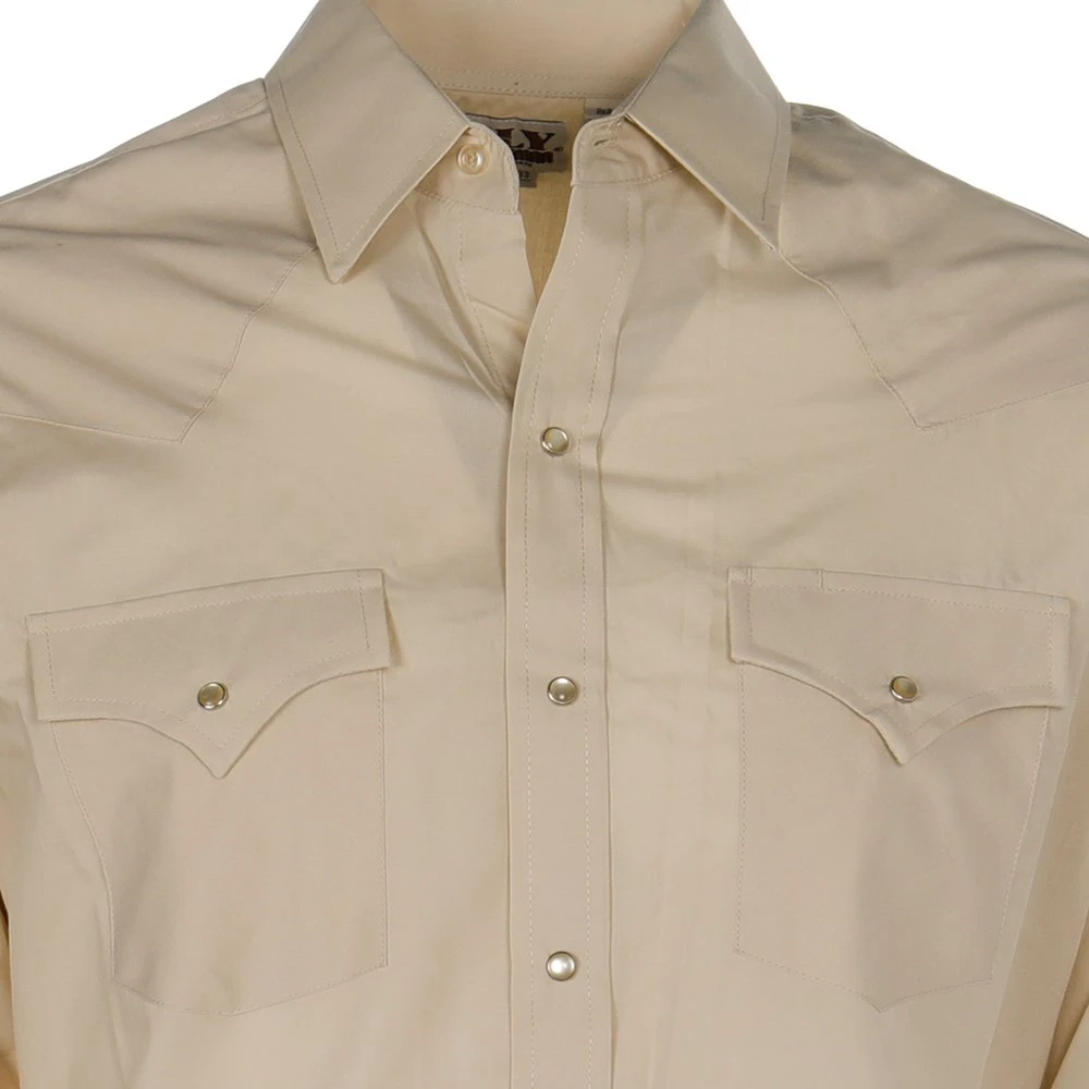 If you are looking for that solid faithful long sleeve shirt, then this tan poly/cotton blind is for you. It is made with 65% poly and 35% cotton, has button snaps and two front pockets.