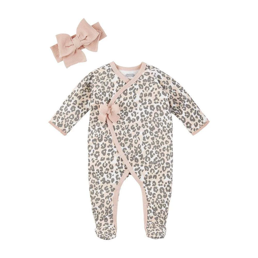 2-piece set. Interlock kimono style footed sleeper. Comes with cotton rib bow headband.