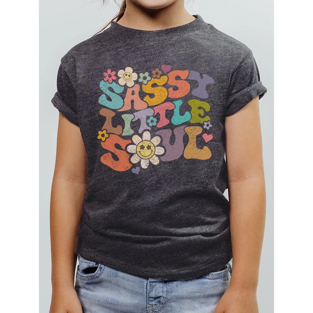 Floral Sassy Little Soul Retro Vintage Flowers Daisy Smiley Spring Kids Graphic Tee. Tees are pre-washed to minimize shrinkage.