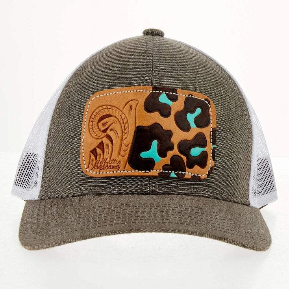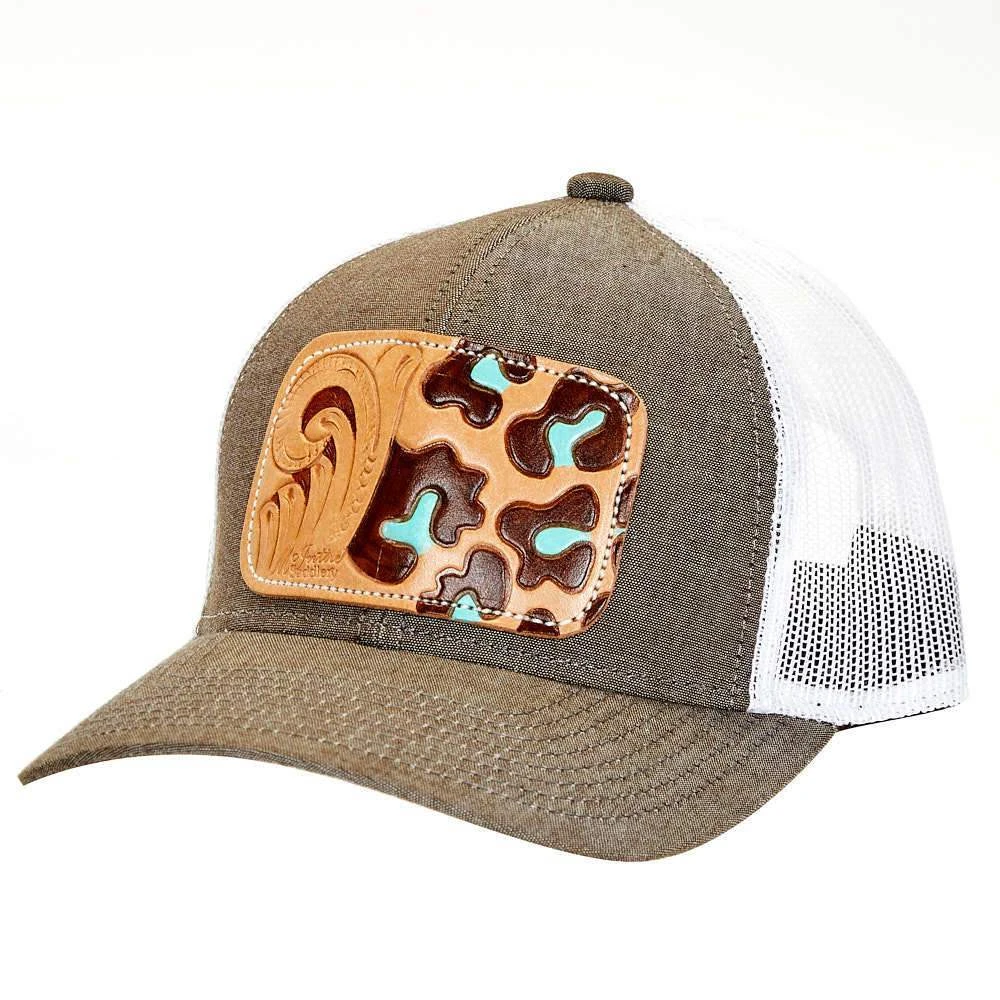 Go for a casual look wearing our Natural Tool and Leopard leather patch cap by McIntire Saddlery.