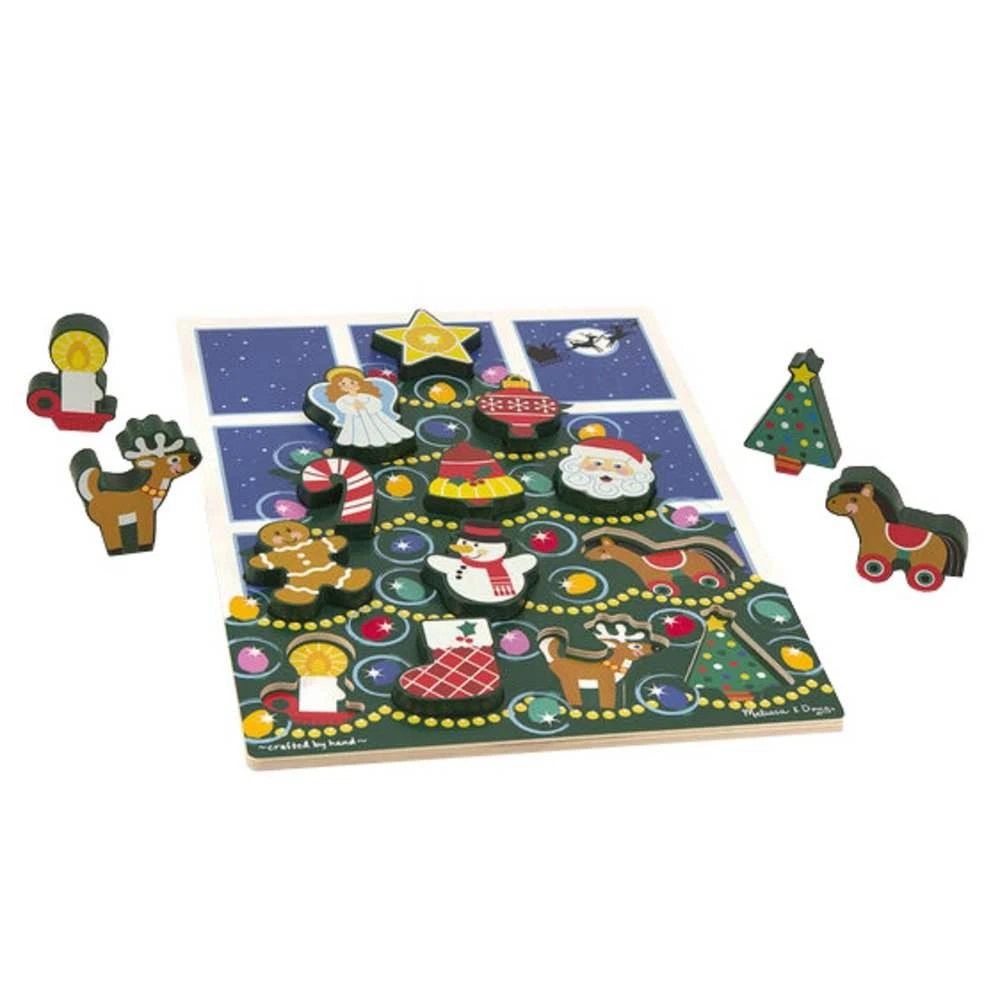 This festive wooden puzzle lets kids trim the Christmas tree again and again! Chunky wooden ornaments fit into the recessed puzzle board, painted with matching artwork to assist beginning puzzlers. The 13 puzzle pieces stand upright for counting and sorting activities too!