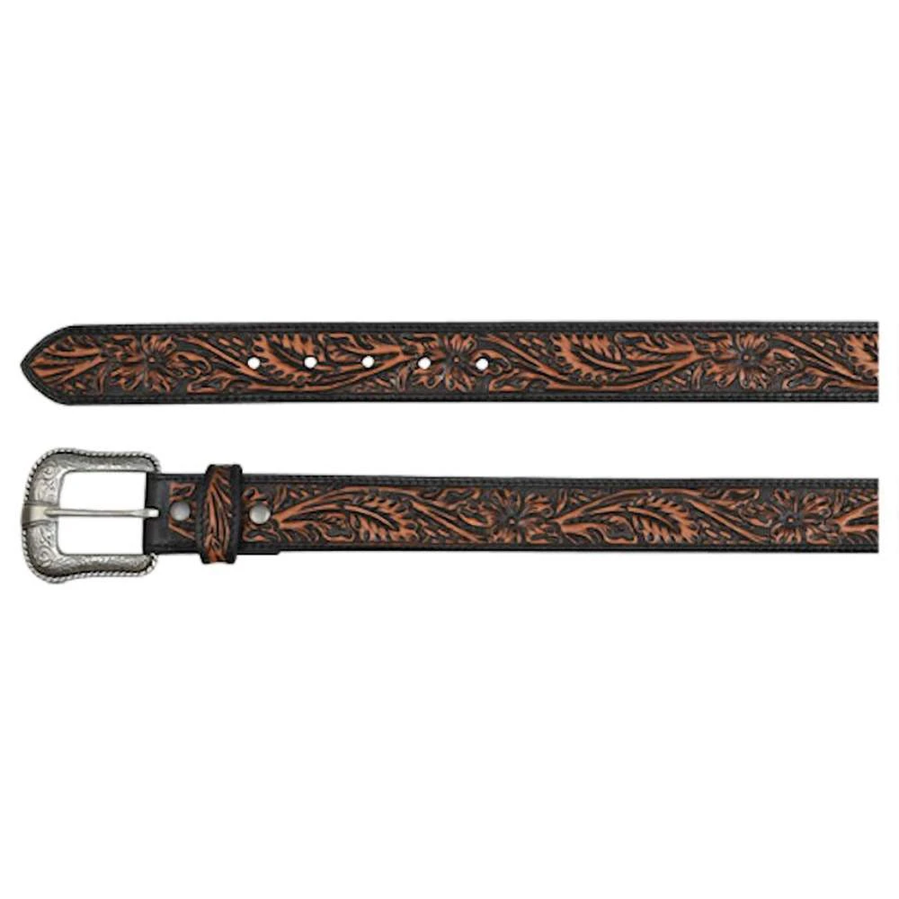 This JP West brown leather belt features tooling, detailed with black accents and a removable buckle.