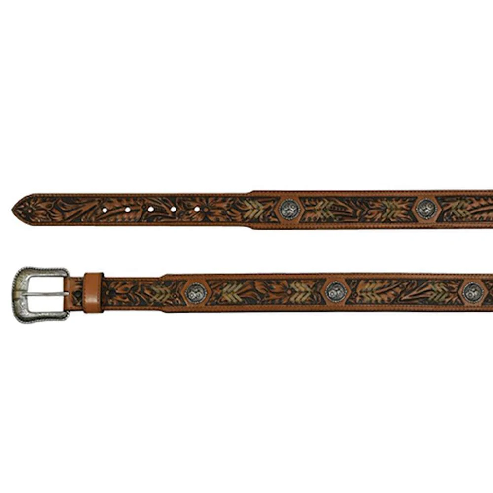 This JP West men’s tapered belt featurestooling, rawhide chevron stitching, conchos and a removable custom JP West buckle.