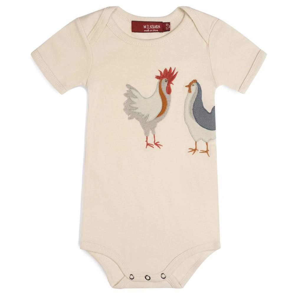 Smiles abound when our little ones wear our stitched and embroidered fabric organic cotton Chicken Appliqué One Piece.