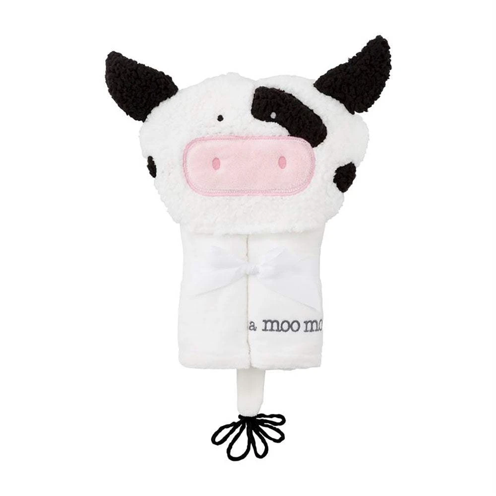 Velour terry cloth infant sized towel features Sherpa hood with dimensional cow facial features. Sized to fit ages up to 18M.