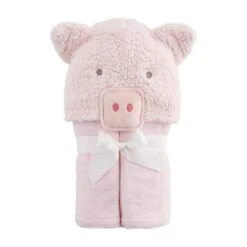 Velour terry cloth infant sized towel features Sherpa hood with dimensional pig facial features, back tail and back loop tag for hanging. Sized to fit ages up to 18M.