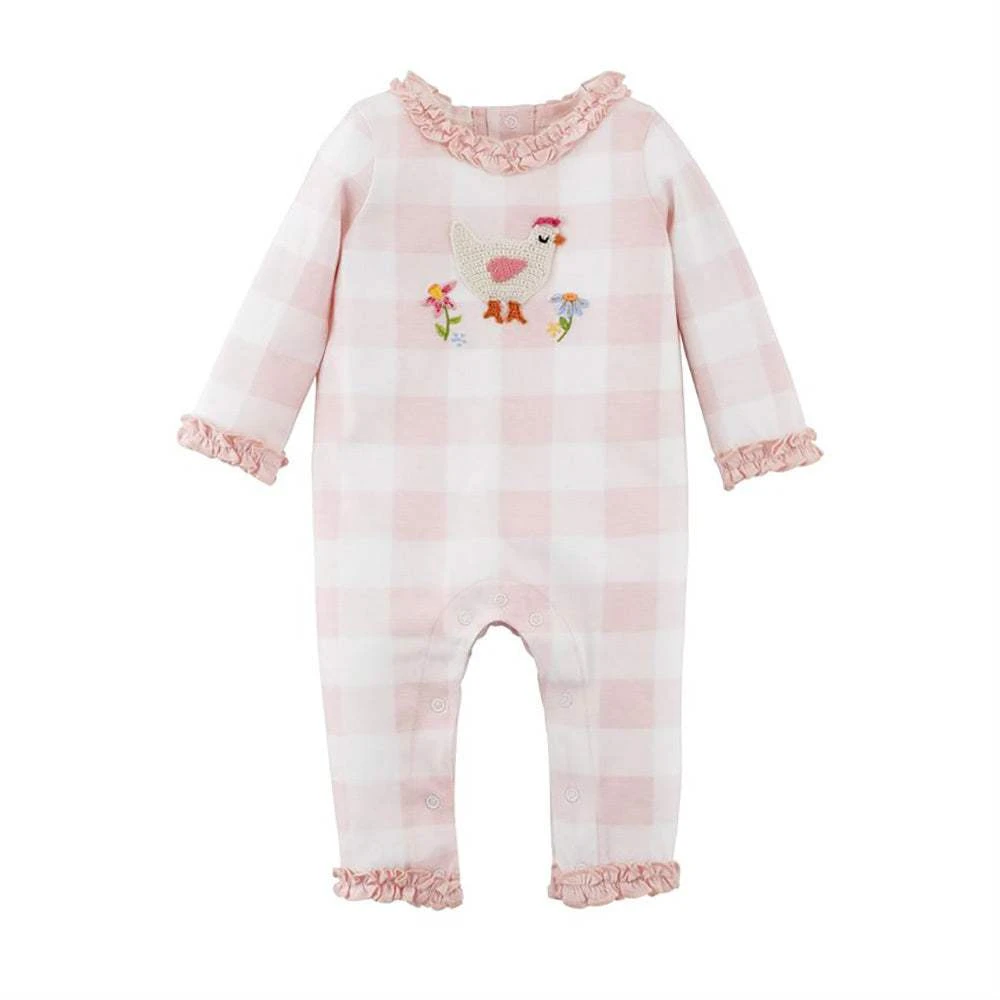 Jersey one-piece with ruffle binding features crochet yarn chicken appliqué with embroidery detail. Inner leg snap closure.