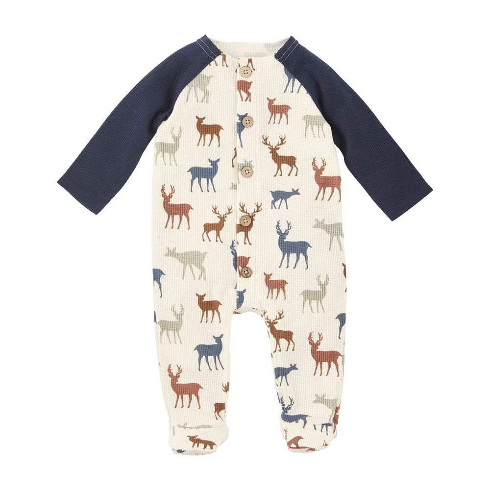 Waffle weave raglan sleeve footed sleeper with wood button placket.