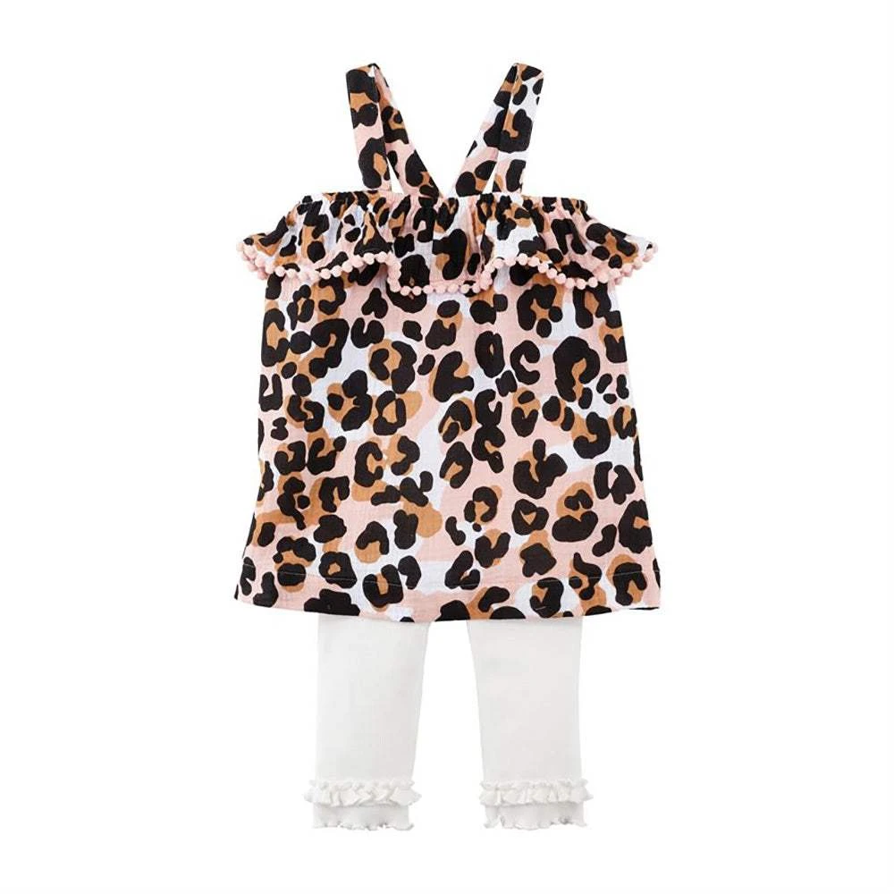 2-piece set. Sleeveless cotton gauze tunic with ruffle pom-pom chest flounce pairs with ribbed knit ruffle capris.