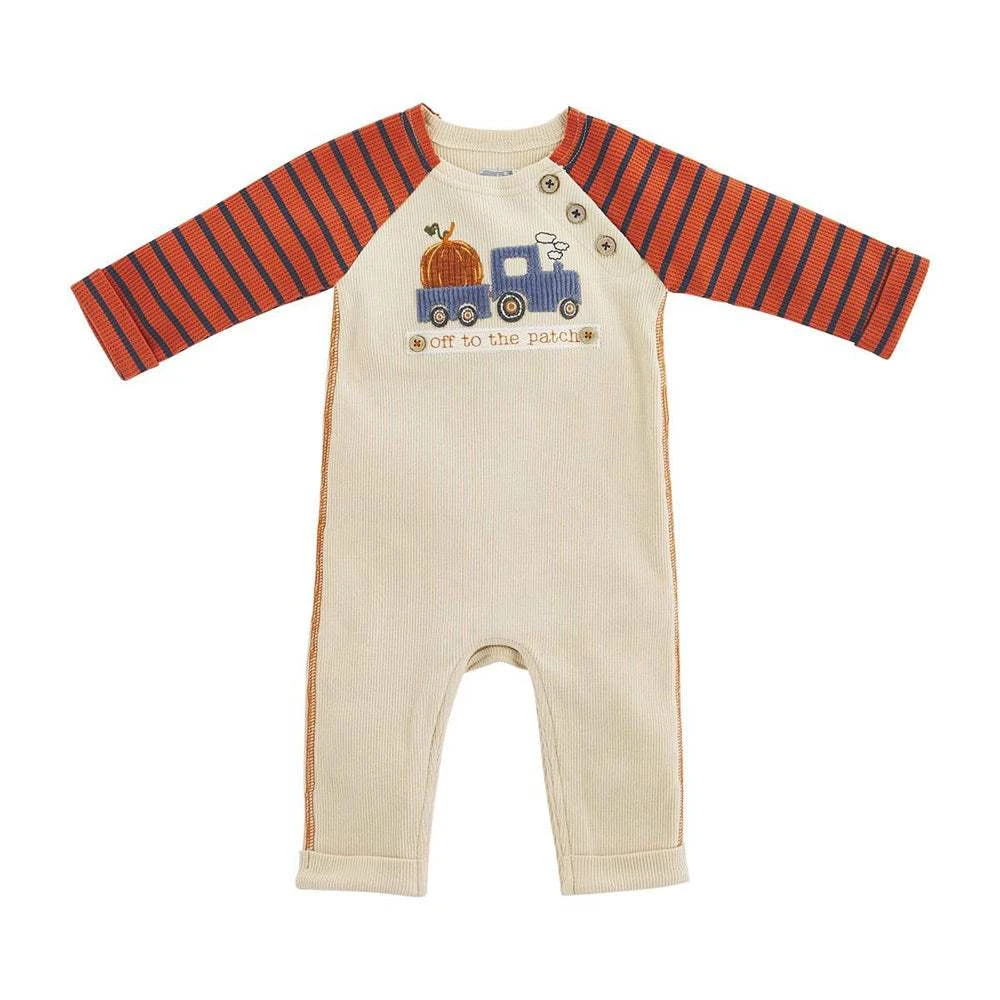 Waffle knit one-piece features coconut wood button placket with pumpkin and truck yarn design.Â
