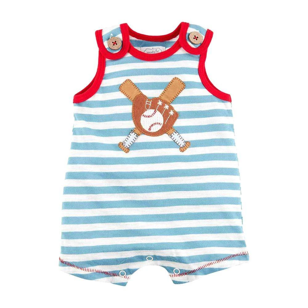 Get ready for your little one’s first baseball season with our Striped Baseball Baby Romper. The cotton slub appliqued romper features coconut wood button shoulders. The romper features a striped pattern with a baseball image on the front. The romper has an inner leg snap closure.