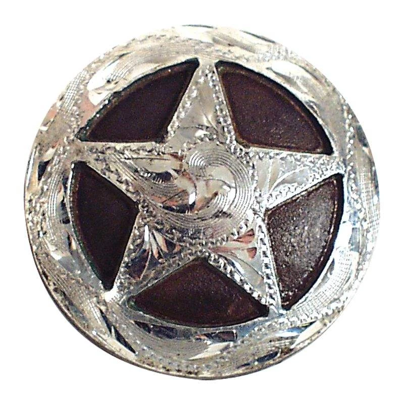 Brown iron and hand engraved sterling silver. The perfect addition to any cowboy’s wardrobe.