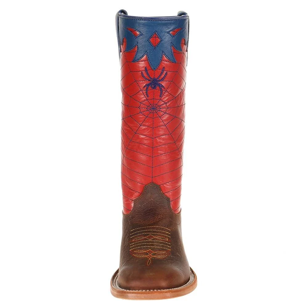 Let your little cowboy feel like a super hero in these Olathe Red & Blue Spider Web Cowboy Boots! These buckaroo-style cowboy boots feature a Toast Bison vamp, red stovepipe top with blue spider web stitching, and blue web-inspired design collar. These boots also showcase a square toe, riding heel, double stitch welt, and leather outsoles.