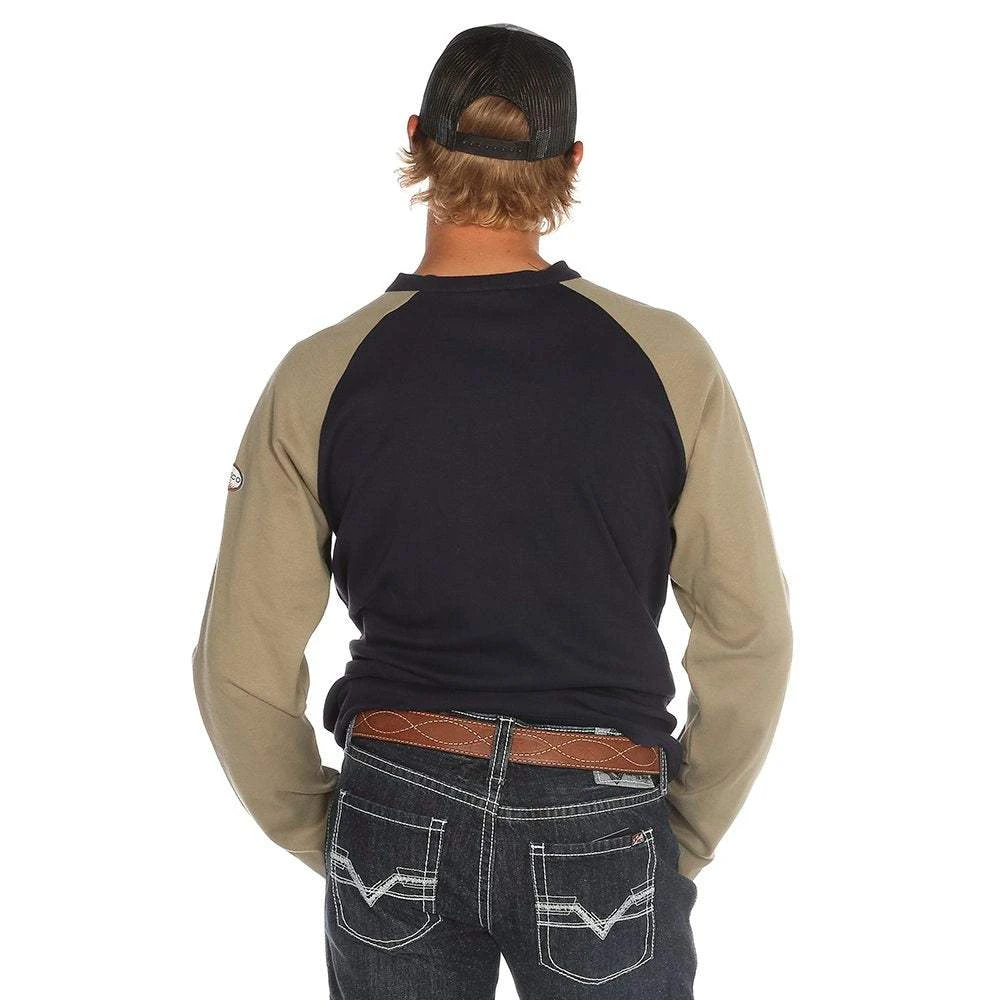 Work safely and look great in this khaki and navy Henley shirt from Rasco FR.