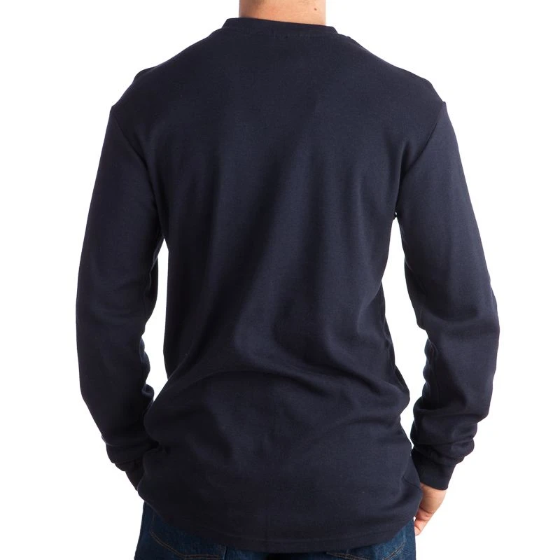 Be comfortable while you work in this long sleeve work tshirt. Made of flame resistant fabric in navy, with a single breast pocket, and three buttons.