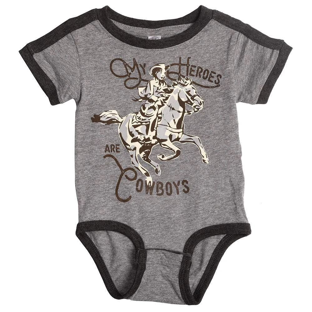 Adorable baby onesie detalited with a two tone gray body. Featuring a classic cowboy graphic and the iconic saying ” my heroes have always been cowboys”.