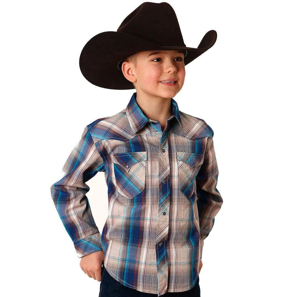 Your little cowboy will look great in this Roper Boy’s Beige & Blue Plaid Western Snap Shirt in or out of the arena.