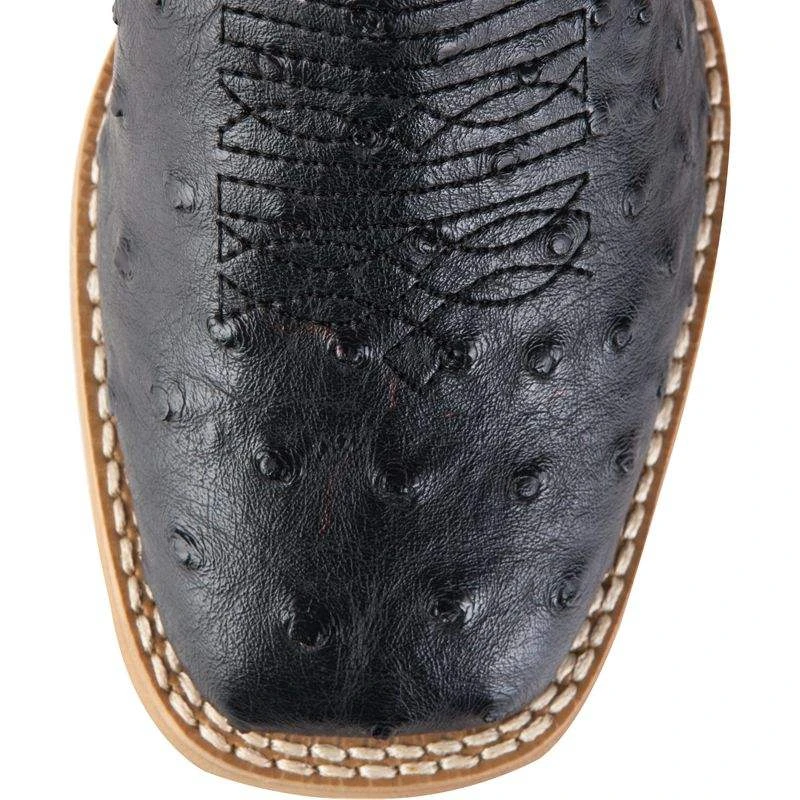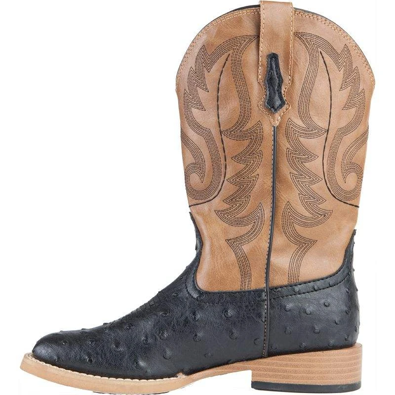 Get stylish pair of Kid’s Roper Black Ostrich Print Cowboy boots for your little one! The black ostrich print vamp coordinates well with the tan top and western stitch pattern. These boots also feature a square toe, padded insole for added comfort, and rubber outsole.