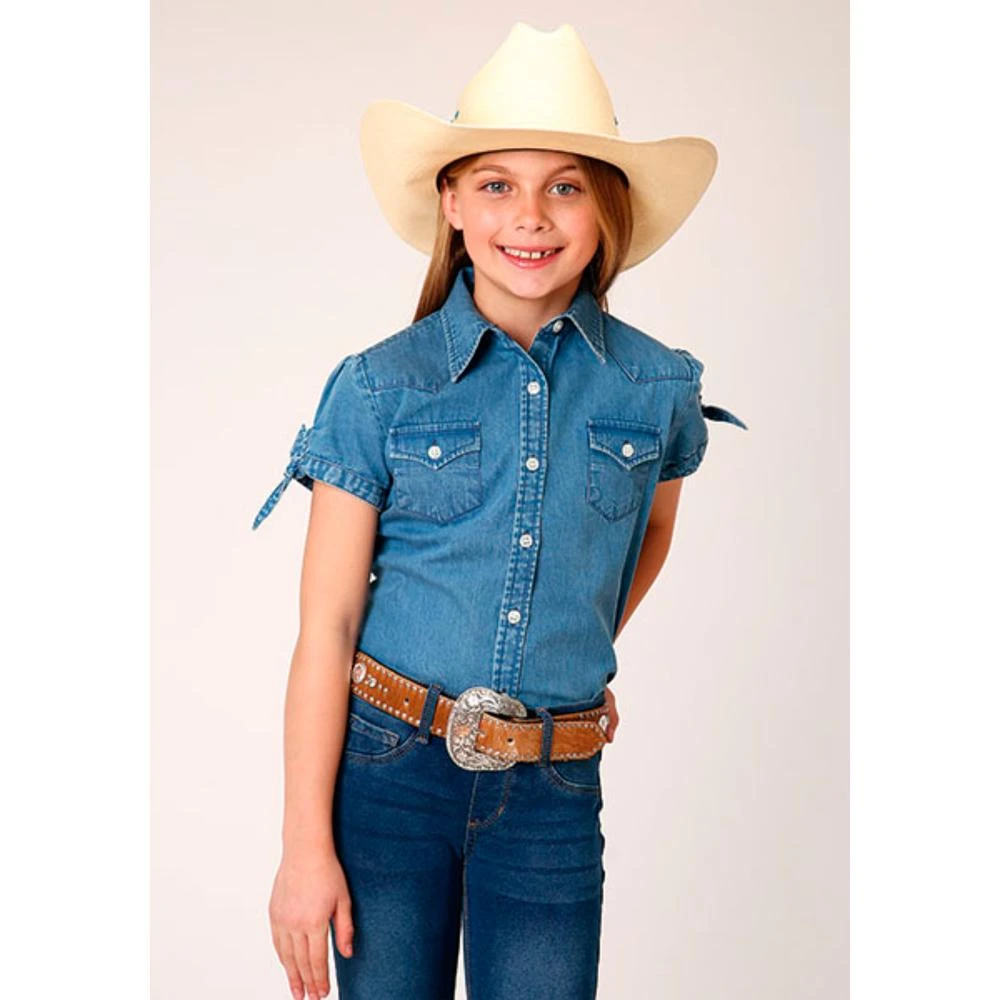This Roper Western Girls Short Sleeve Denim Blue Shirt will match her hat and her belt and buckle with her favorite pair pf jeans.