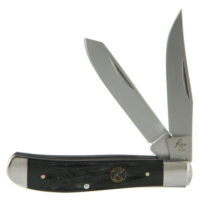 The Roper Knives Black Bone Trapper Knife features a jet black jigged bone handle and measures 3 1/2″ Closed.