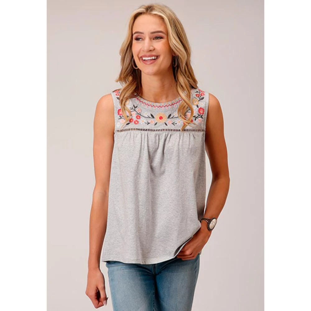 Roper Ladies Sleeveless Embroidered Heather Grey Top