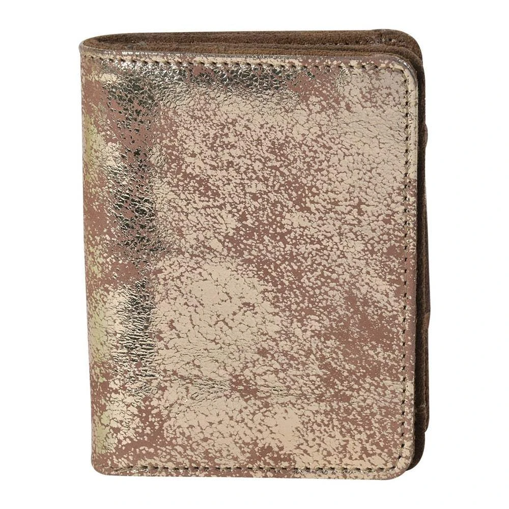 The Flaxen Roan Soni Wallet is crafted in a golden, metallic full grain leather that is buffed for a casual feel and finished with a glamorous, golden metallic shine.