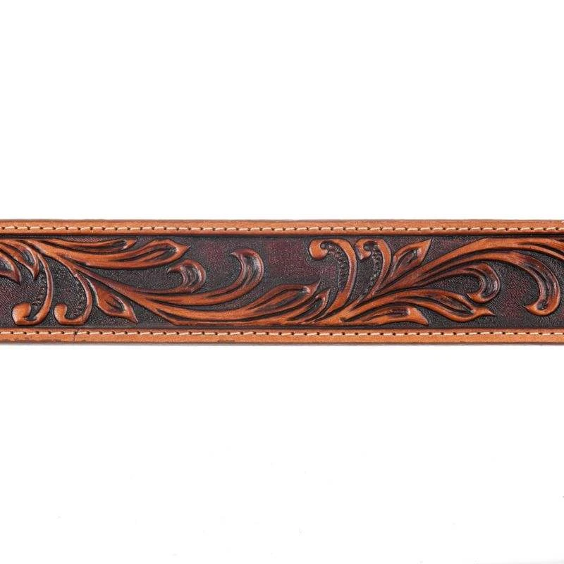 This fancy Men’s Tony Lama Western Rider Tooled Leather Belt will look great for a night out or a day at the arena. This 1 1/2in wide belt is made in the USA of top-grain leather, and has a beautiful medium oil finish. The leather tooling is intricate and expertly done, and the buckle set complements the belt perfectly. The two tone buckle set includes a tooled buckle and keeper, both of which are removable. The silverton set is accented with goldtone rope accents and bucking horse with saddle bronc rider.