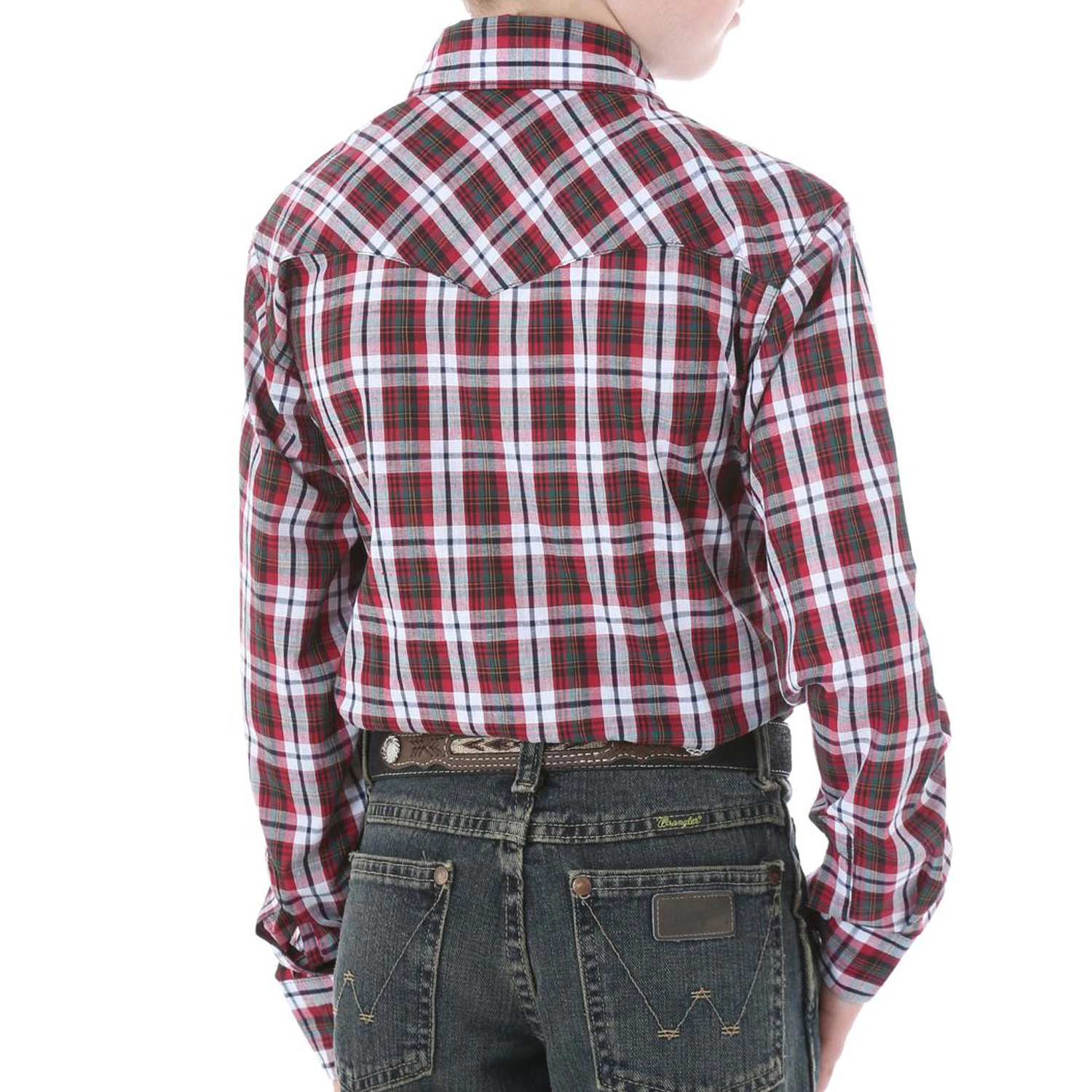 Boy’s Wrangler Snap Shirt – Plaid Long sleeve. Western yokes.2 snap flap pockets. 55% cotton/45% polyester.Â