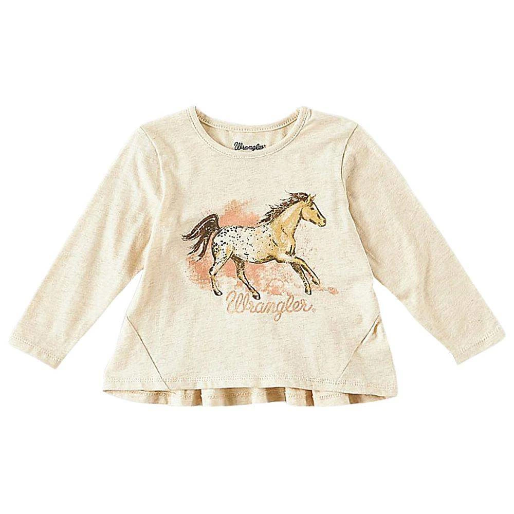Your young cowgirl is sure to steal the show everywhere she goes in this little girl’s long-sleeve horse run tee. Perfect for special occasions, picture day, and everything in between, this shirt will quickly become her favorite for dressing up. It’s made of a comfortable cotton blend with stretch, so she can conquer the world. It features a dreamy chest print of a galloping Appaloosa and the Wrangler® rope logo. All she needs to complete the look is a pair of little girl’s Western jeans.