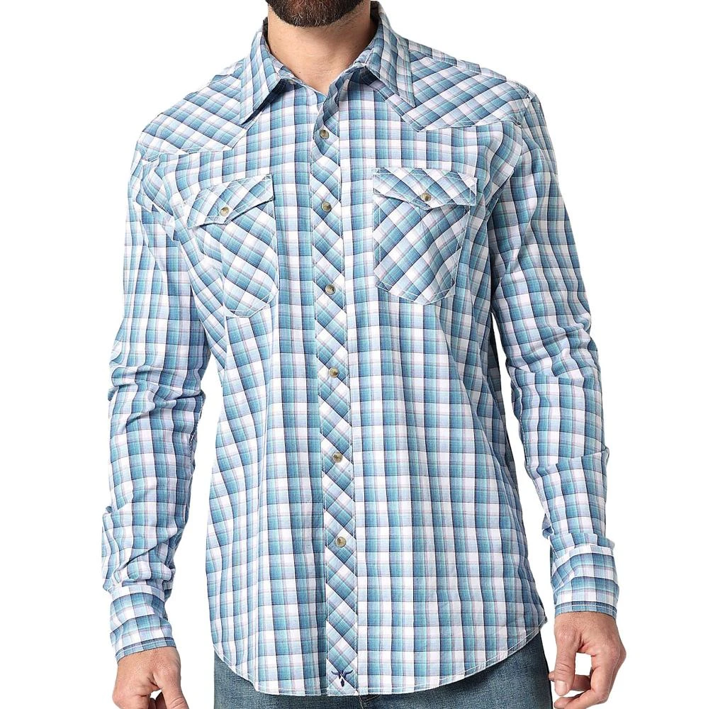 Some days are full of surprises, but the quality of your clothing should never leave you guessing. Combining classic Wrangler® styling with a contemporary look and feel, the men’s Wrangler 20X® Competition Advanced Comfort long-sleeve two-pocket western snap plaid shirt keeps you comfortable both in and out of the saddle. It features a modern fit, a spread collar, pointed yokes, contrast stitching, snap cuffs, and full snap closure at the placket. It’s crafted from cotton with just a subtle amount of stretch for full mobility. With a variety of colors to choose from, you’ll want to wear this shirt every day of the week with your favorite pair of Wrangler jeans.