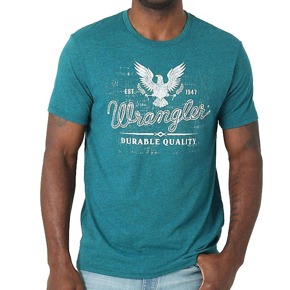 Classics are something we know a thing or two about. This men’s Wrangler durable quality graphic t-shirt offers plenty of style and comfort for the season ahead. With an eagle emblem at the chest, this timeless t-shirt pays homage to our roots and pride, offering a subtle reminder of our reputation for durable quality. It’s crafted from a comfortable cotton blend and features a classic heathered style for a worn-in look you’ll appreciate. Wear it with jeans or cargo pants to complete the look.