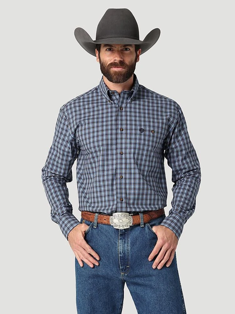 Every cowboy needs a dependable button-down he can wear any day of the week. Luckily, the men’s George Strait long-sleeve button-down two-pocket plaid shirt comes fully equipped with everything you need to make your mark. It’s made of a cotton twill blend that feels just as good as it looks. This classic plaid button-down features a relaxed fit, a pointed collar, a straight back yoke, two button-through chest pockets, adjustable cuffs, a curved hem, and the George Strait logo embroidered at the chest for a stamp of authenticity. Wear yours with one of the George Strait Cowboy Cut® jeans to complete your look for any occasion.